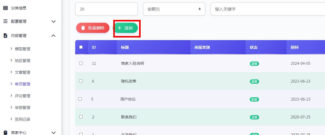 找到后台内容管理 单页管理如下图左上角添加内容