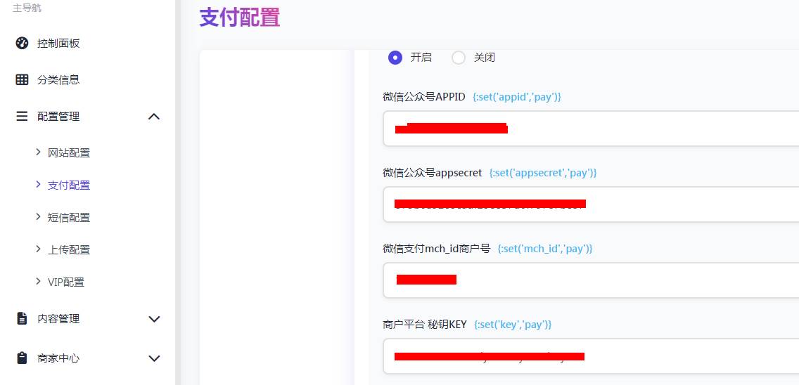 开通JSAPI支付后,需获取两个关键信息,用于填写到自身后台的“支付配置”中(后台填写位置参考:配置管理 → 支付配置,图示如下):