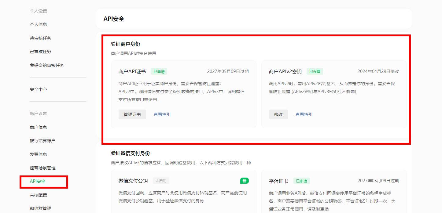 进入微信商户平台的「账户中心」→「API安全」页面,根据页面内的操作指引(如验证身份、设置秘钥等),完成商户平台秘钥KEY的获取或设置,具体位置参考图示: