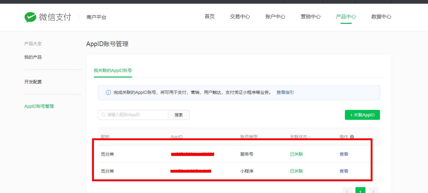 最后一步,需将微信商户号与对应的服务号或小程序账号关联,确保支付功能正常调用,路径为:「产品中心」→「AppID账号管理」,点击“添加关联账号”,选择需关联的服务号或小程序完成操作,具体参考图示: